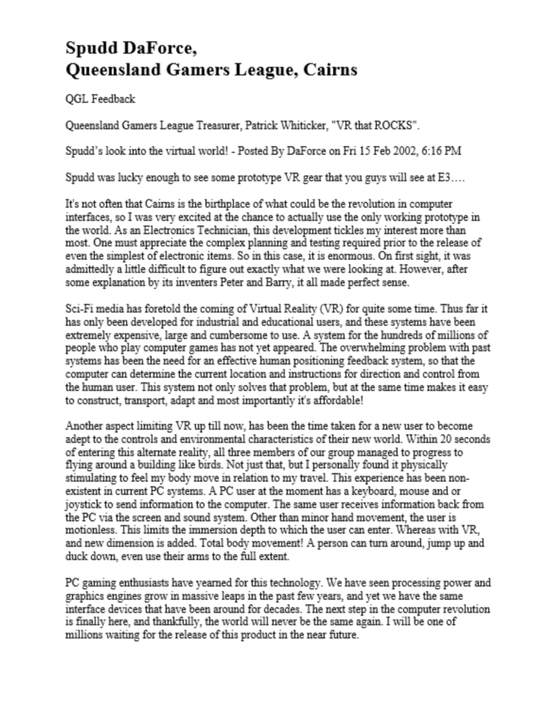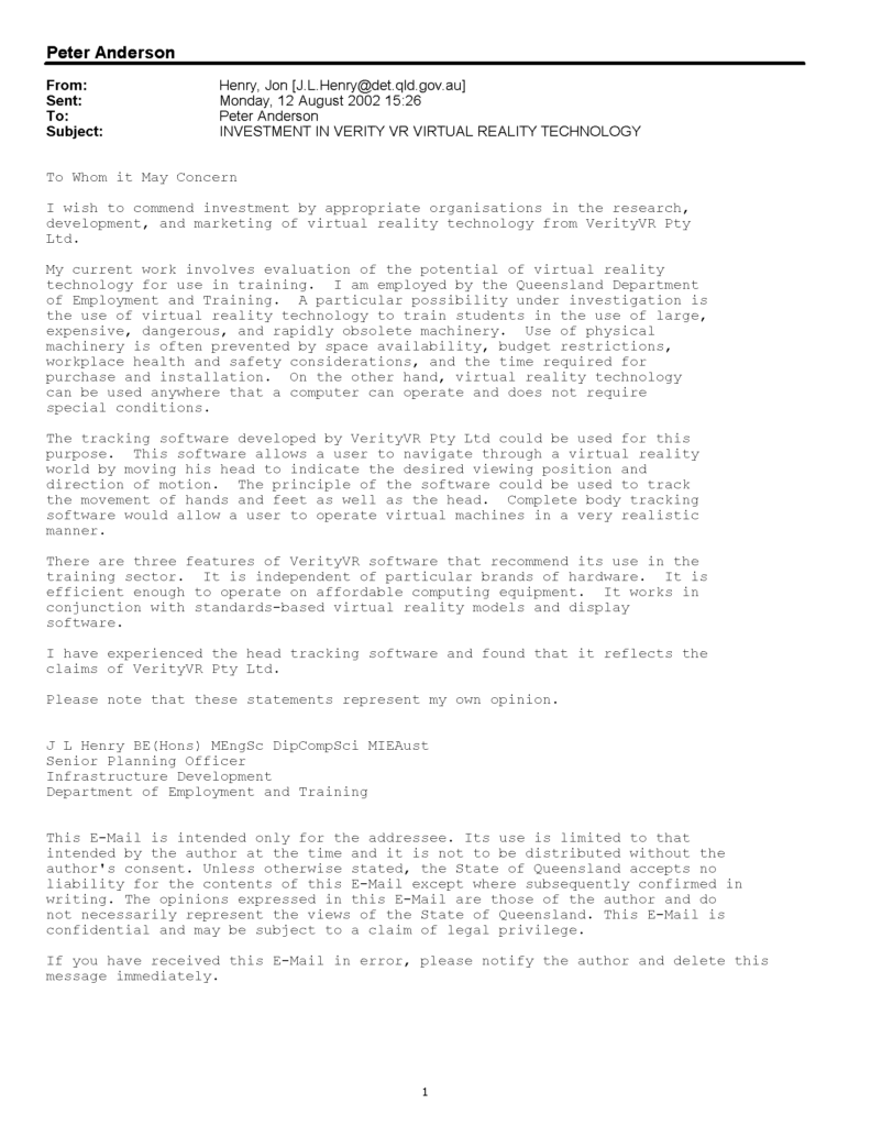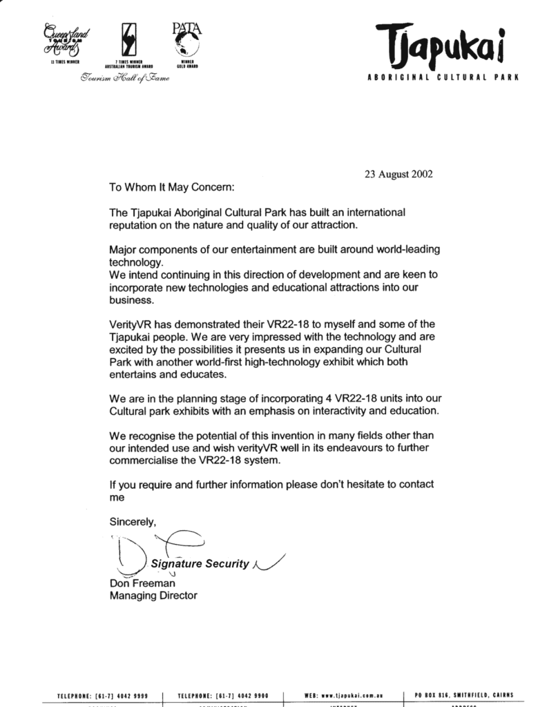 This entitled the recently formed subsidiary company VerityVR Pty Ltd company to show and demonstrate a proto-type VR system based on the OTCI invention at the 2002 Asia-Pacific region finals held in Kuala Lumpur, Malaysia. While not the winners in this competition much was learned regarding the necessary technology and business development required to penetrate the Asian and wider markets.